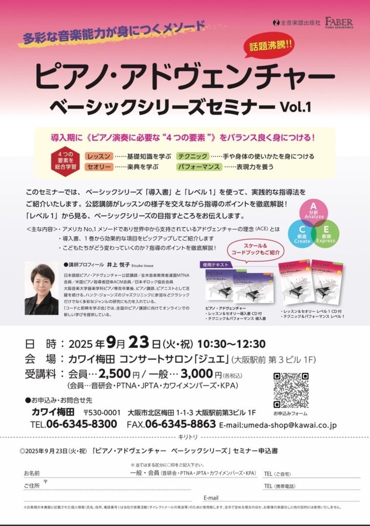このセミナーでは、ベーシックシリーズ「導入書」と「レベル1」を使って、実践的な指導法をご紹介いたします。公認講師がレッスンの様子を交えながら指導のポイントを徹底解説!